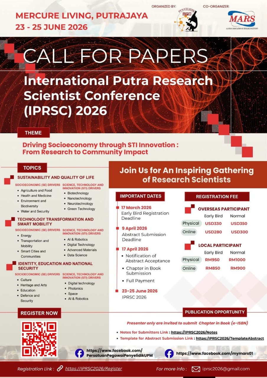 You are warmly invited to join the International Putra Research Scientists Conference (IPRSC) 2026, co-organized by the UPM Research Officer Association (PenyelidikUPM) and the Malaysian Association of Research Scientists (MARS).